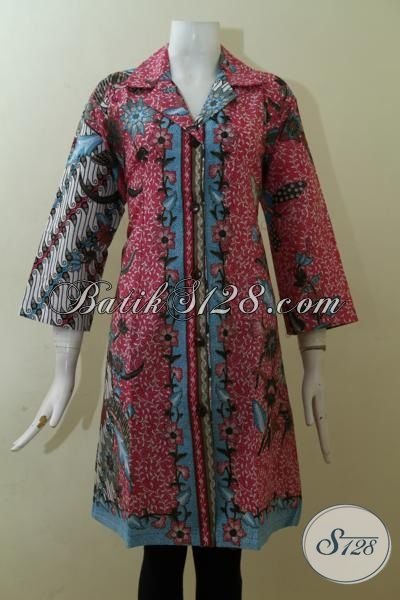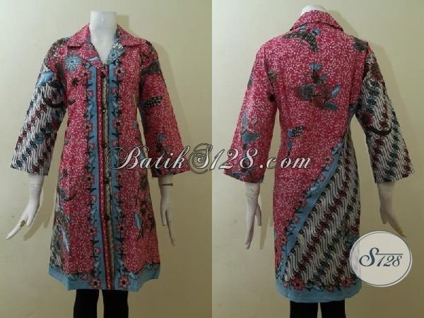 Dress Batik Dua Motif Warna Merah Desain paling Keren, Baju Batik Seragam Kerja Wanita Muda Dan Dewasa Tampil Lebih Bergaya [DR2525P-XXL]