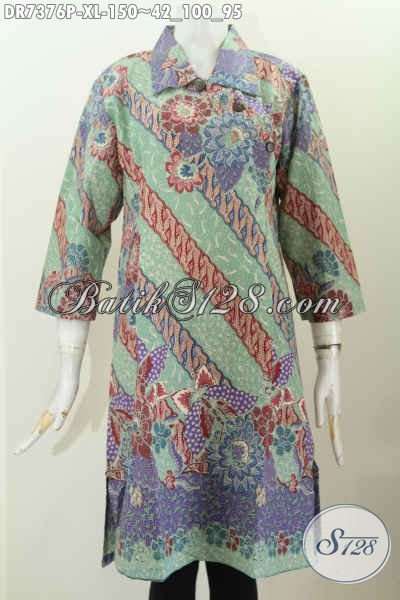 Dress Batik Elegan Buatan Solo Asli, Baju Batik Modis Kerah Lancip Dengan Kancing Miring, Tampil Mempesona [DR7376P-XL]