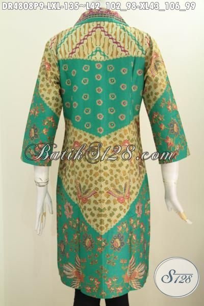 Dress Batik Hijau Motif Klasik, Pakaian Batik Halus Proses Printing Desain Istimewa Kerah Kotak Lancip, Pakaian Batik Printing Motif Sinaran Elegan Untuk Acara Formal [DR4808P-L , XL]