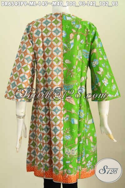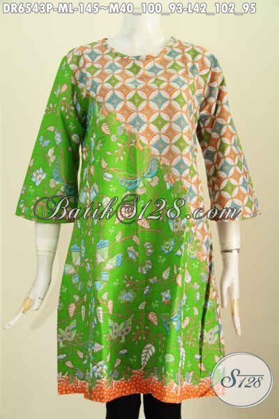 Dress Batik Hijau Motif Kombinasi, Baju Printing Modis Kwalitas Istimewa Model Tanpa Krah Lebih Keren Dan Gaya [DR6543P-M , L]