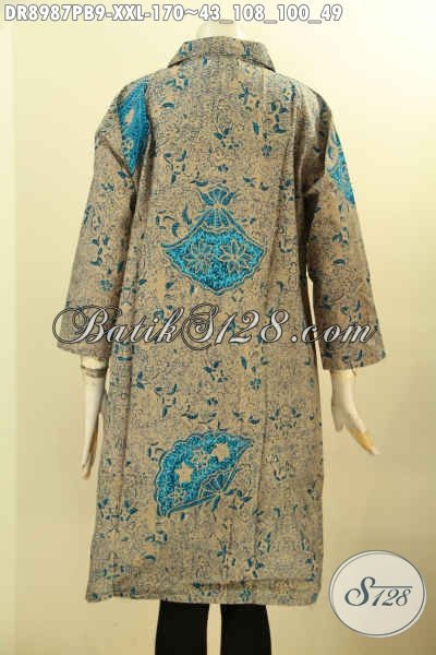 Dress Batik Jumbo Cewek Gemuk, Pakaian Batik Elegan Motif Mewah Proses Printing Cabut Bahan Adem Nayaman Di Pakai, Busana Batik Istimew Model Kerah Kancing Depan Lengan 7/8, Cocok Banget Buat Ngantor [DR8987PB-XXL]