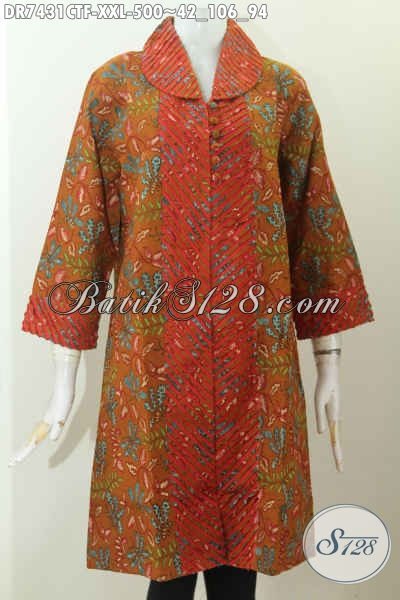 Dress Batik Jumbo Motif Elegan Proses Cap Tulis, Busana Batik Model Cacah Bagian Kerah Daleman Full Furing, Wanita Gemuk Tampil Mempesona [DR7431CTF-XXL]