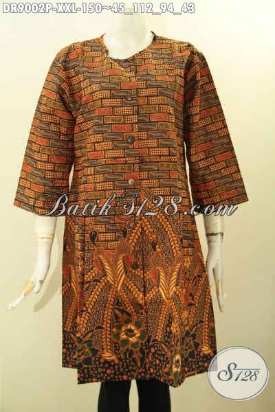 Dress Batik Jumbo Motif Klasik, Busana Batik Wanita Gemuk Nan Elegan Model Terbaru Tren Masa Kini Tidak Pakai Kerah Bahan Halus Nyaman Di Pakai, Busana Batik Istimewa Lengan 3/4 Kancing Depan, Bisa Untuk Santai Atau Resmi [DR9002P-XXL]