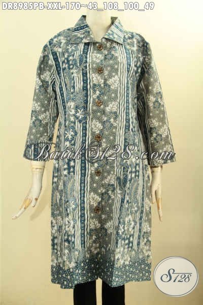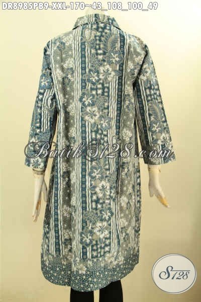 Dress Batik Jumbo Wanita Gemuk, Produk Busana Batik Istimewa Model Lengan 7/8 Dengan Kerah Dan Kancing Depan Motif Kekinian Proses Printing Cabut Hanya 100 Ribuan Saja, Pas Untuk Acara Resmi [DR8985PB-XXL]