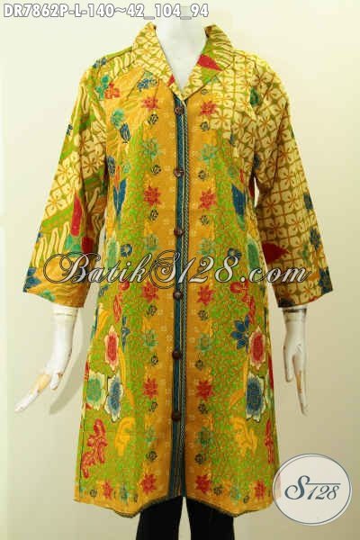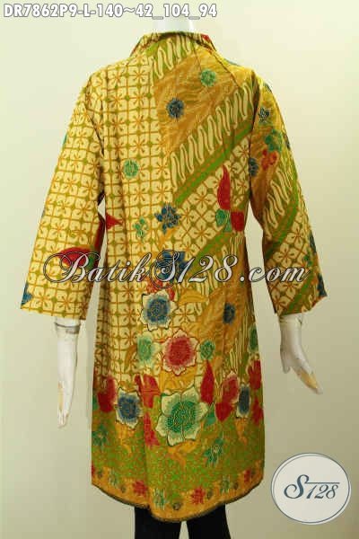 Dress Batik Kerah Langsung Motif Kombinasi, Pakaian Batik Modis Halus Kwalitas Istimewa Proses Printing 100 Ribuan [DR7862P-L]