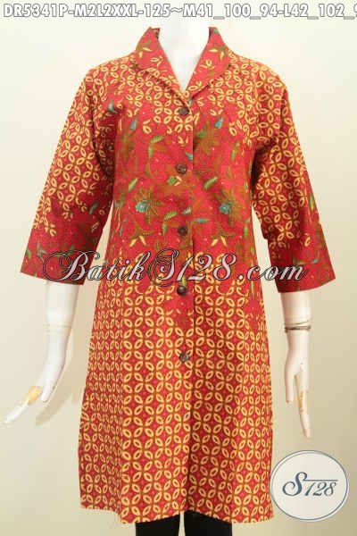 Dress Batik Kerah Langsung Warna Merah Motif Mewah, Baju Batik Printing Berbahan Halus Dengan Harga Yang Terjangkau [DR5341P-L , XXL]