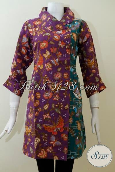Dress Batik Kombinasi Warna Ungu Dan Hijau Berpadu dengan Motif-Motif Unik Trend Masa Kini, Baju Batik Print Harga 100 Ribuan Bisa Tampil Berkelas [DR2063P-M]