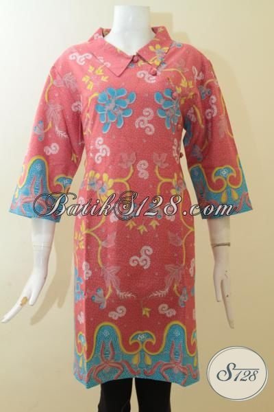 Dress Batik Merah Jambu Lengan Tiga Perempat Proses Print, Pakaian Batik Murah model Mewah Tampil Wah [DR2945P-L]