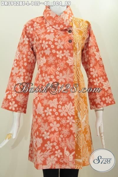 Dress Batik Orange Modern Kombinasi Kuning Desain Kerah Miring, Pakaian Batik Masa Kini Wanita Karir Motif Keren Proses Kombinasi Tulis [DR3902BT-L]