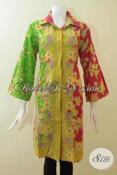 Dress Batik Paling Trendy Saat Ini Dengan Kombinasi Warna Hijau Kuning Dan Merah Berpadu Motif Simple Yang Mewah, Pas buat Seragam Kerja Wanita Karir [DR2675P-XL]