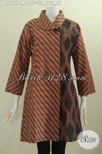 Dress Batik Solo Motif Mewah Dan Elegan, Baju Batik Klasik Model Kerah Miring Harga Terjangkau Proses Printing, Cocok Untuk Seragam Kerja [DR5621P-M]