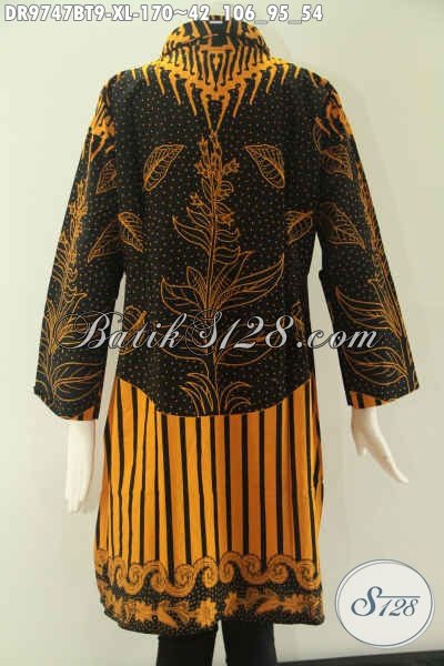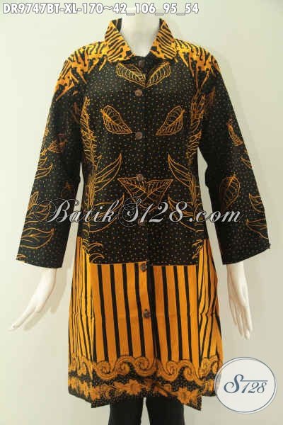 Dress Batik Solo Terkini Model Kerah Lengan 7/8, Busana Batik Wanita Karir Nan Istimewa Yang Di Lengkapi Kancing Depan Sampai Bawah Untuk Penampilan Lebih Stylish [DR9747BT-XL]