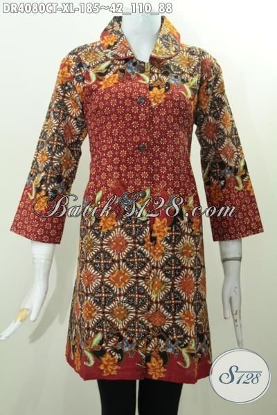 Dress Batik Terbaru Bagus Desain Mewah Kerah Bulat, Baju Kerja Model Terkini Untuk Perempuan Dewasa Tampil Stylish [DR4080CT-XL]