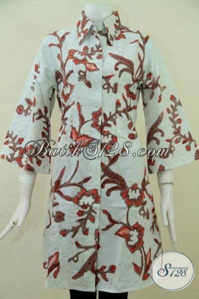 Dress Batik Terbaru Dengan Dasar Putih Berpadu Goresan Motif Bunga Warna Merah Berkesan Exclusive Dan Mewah, Cocok Untuk Wanita Muda Dan Dewasa [DR1846BT-L]