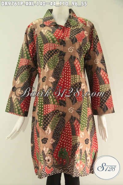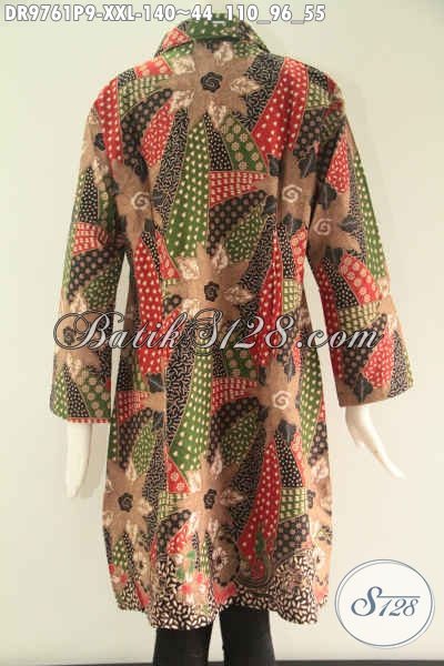 Dress Batik Wanita Gemuk Lengan 7/8, Busana Batik Modern Motif Elegan Jenis Print Pakai Kerah Dan Kancing Depan Sampai Bawah, Penampilan Lebih Cantik Dan Sempurna [DR9761P-XXL]