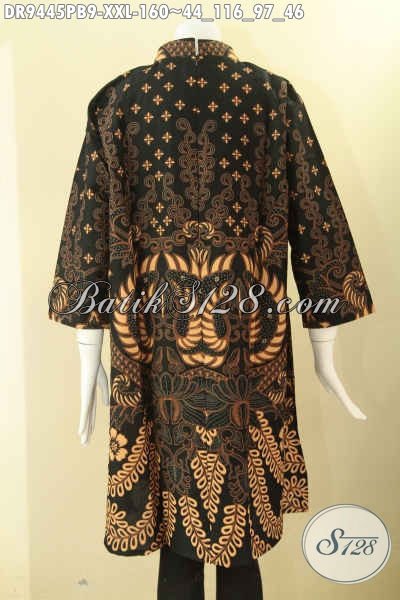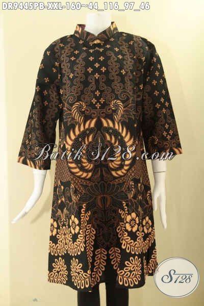 Dress Batik Wanita Gemuk Model Resleting Belakang, Baju Batik Elegan Kerah Shanghai Lengan 7/8 Berpadu Motif Bagus Khas Solo Nan Berkelas, Exclusive Untuk Perempuan Berbadan Gemuk [DR9445PB-XXL]