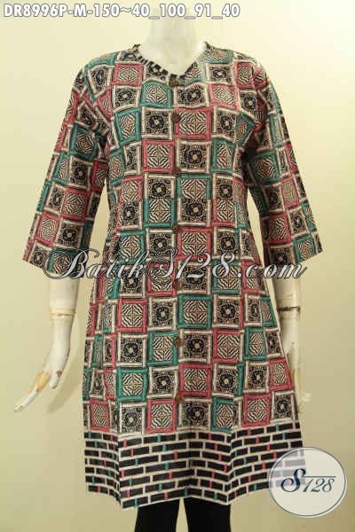 Dress Batik Wanita Muda, Pakaian Batik Motif Unik Desain Keren Lengan 3/4 Kancing Depan Tanpa Kerah, Pas Untuk Kerja Dan Hangout [DR8996P-M]