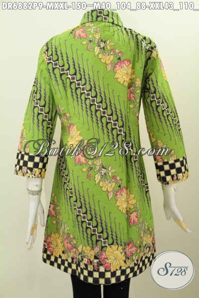 Dress Batik Warna Hijau Motif Modern Klasik, Contoh Baju Batik Kerja Wanita Untuk Penampilan Lebih Bersahaja [DR6882P-M , XXL]