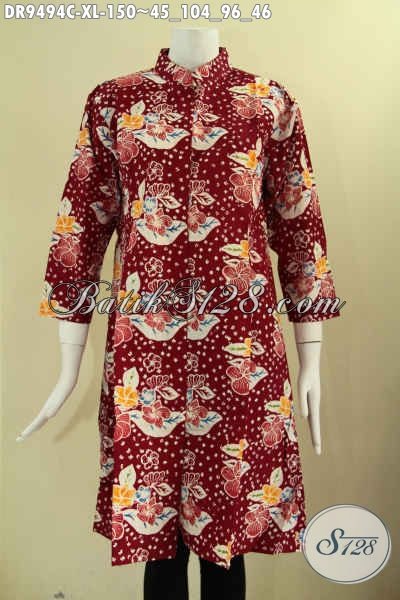 Dress Batik Warna Merah Motif Bunga Model Lengan 7/8, Pakaian Batik Wanita Masa Kini Kerah Shanghai Yang Di Lengkapi Kancing Depan Terlihat Modis [DR9494C-XL]