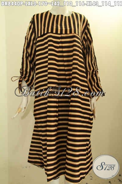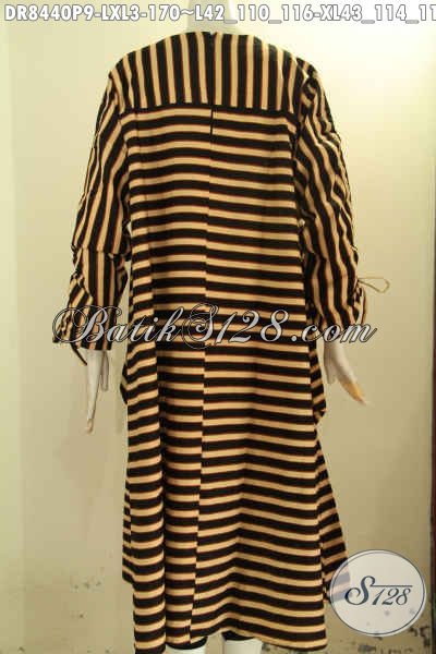 Dress Batim Motif Garis Nan Modis Dam Keren, Busana Batik Printing Desain Pias Depan Dengan Lengan Bertali Serta Resleting Belakang, Penampilan Canti Menawan [DR8440P-L , XL]