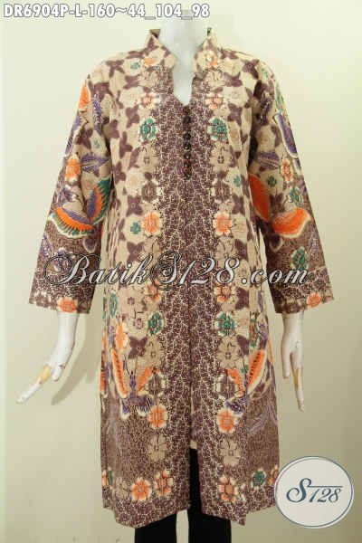 Foto Baju Batik Wanita Modern, Desain Dress Batik Solo Terkini Bahan Halus Motif Printing Pakai Kancing Banyak Untuk Kerja Dan Kondangan [DR6904P-L]