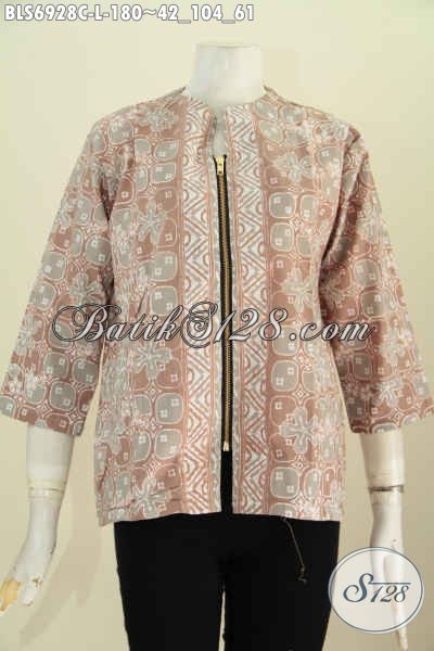Foto Baju Kerja Batik Wanita, Blus Warna Pastel Model Resleting Depan Bahan Halus Motif Unik Proses Cap Di Lengkapi Kantong Paspol Kanan Kiri Hanya 180 Ribu [BLS6928C-L]
