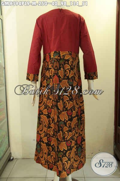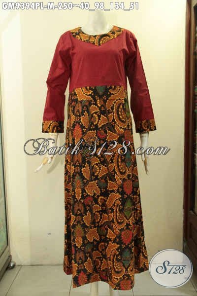 Gamis Batik Modern Motif Elegan Kombinasi Kain Polos Warna Merah Desain Kekinian Lengan Ada Manset Dan Kancing, Abaya Batik Masa Kini Pakai Saku Daleman Untuk Wanita Tampil Gaya [GM9394PL-M]