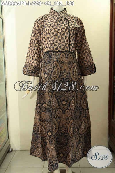 Gamis Batik Wanita Kerja, Busana Batik Syar’i Kerah Shanghai Plisir Polos, Busan Batik Muslim Cewek Resleting Belakang Dual Motif, Tampil Anggun Dan Cantik [GM8862PB-L]