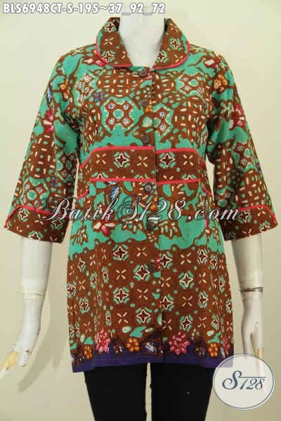 Grosir Baju batik Kerja Wanita, Pakaian Batik Solo Model Blus Kerah Plisir Kain Polos, Motif Bagus Proses Cap Tulis, Tampil Berkharisma [BLS6948CT-S]