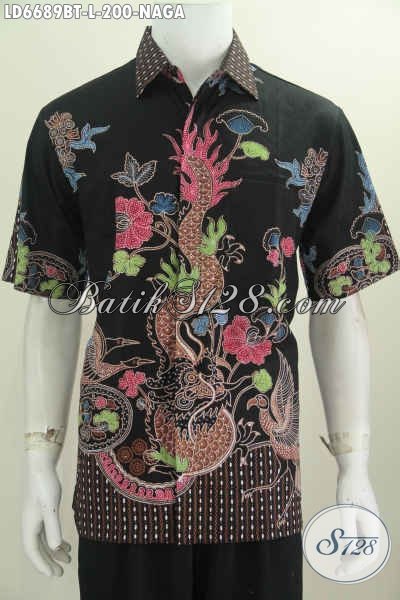 Hem Batik Elegan Dengan Dasar Hitam Motif Naga, Pakaian Batik Lengan Pendek Untuk Pria Tampil Gagah Berkarakter Berbahan Halus Proses Kombinasi Tulis [LD6689BT-L]