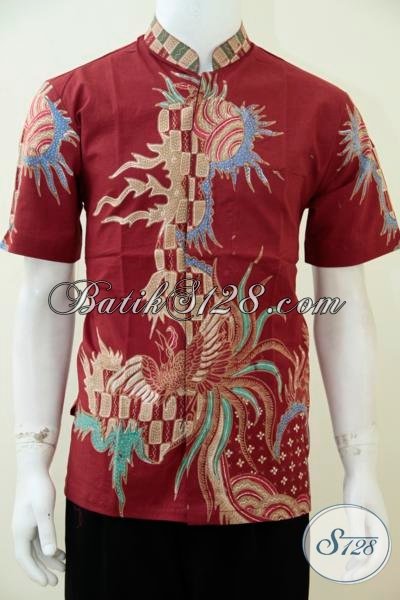 Hem Batik Koko Lengan Pendek Dasar Merah Motif Keren Banget Mas Bro, Baju Batik Gaul Pria Muda Masa Kini [LD2544TK-M]