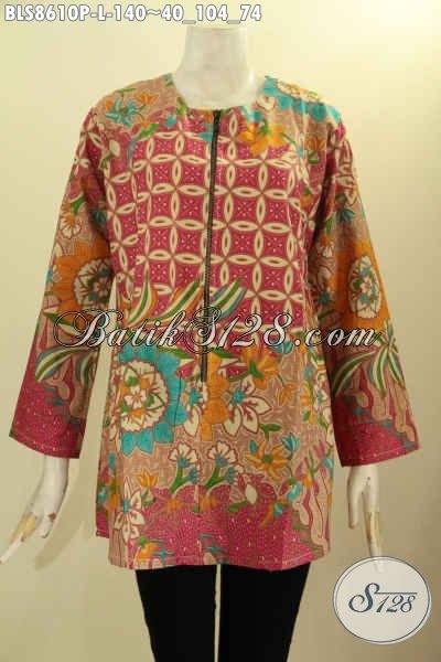 Model : Baju Kemeja Batik Blouse Wanita Resleting Depan Lengan Panjang, Kantong Paspol Di Bagian Pinggang Kiri Dan Kanan