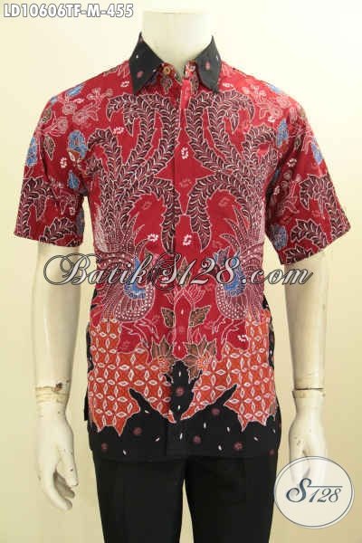 Jual Baju Batik Pria Muda Desain Jaman Now, Kemeja Batik Keren Warna Merah Lengan Pendek Motif Unik Proses Tulis Daleman Full Furing Harga 400 Ribuan [LD10606TF-M]