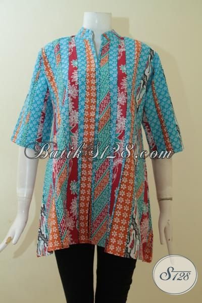 Jual Baju Blus Batik Online Berkelas, Pakaian Batik Biru Dengan Kombinasi Warna Berkelas, Batik Print Solo Motif Keren Pas Buat Pesta [BLS3016P-M , XXL]