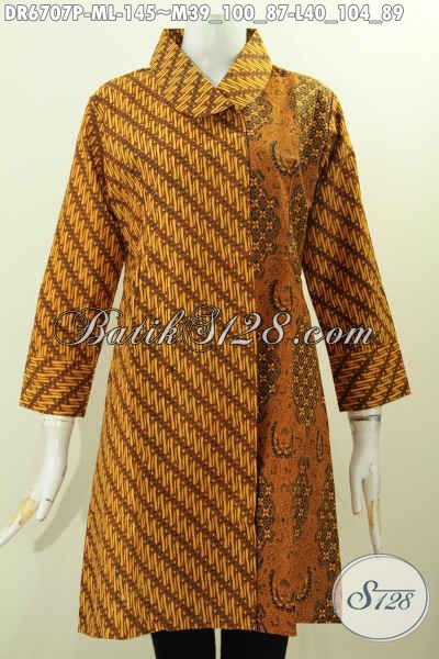 Jual Baju Dress Batik Klasik Istimewa, Pakaian Batik Solo Halus Proses Printing Model Kerah Miring Bahan Adem Pas Banget Untuk Acara Resmi [DR6707P-M , L]