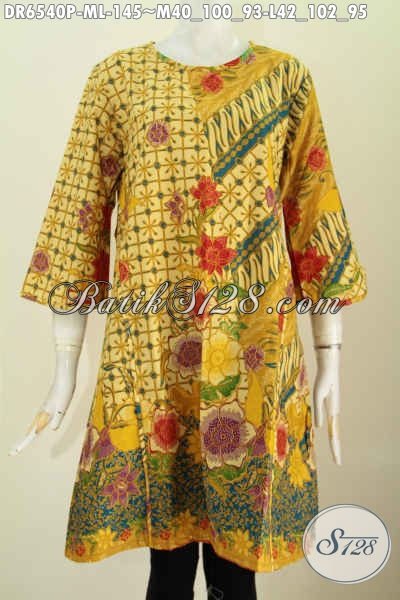 Jual Baju Dress Batik Online, Pakaian Batik Solo Masa Kini Model Tanpa Krah Pake Resleting Belakang Yan Banyak Di Cari Wanita Karir [DR6540P-M , L]