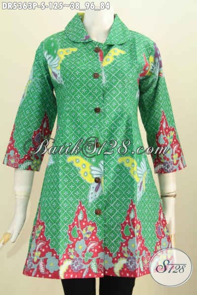 Jual Baju Dress Batik Ukuran Kecil, Busana Batik Wanita Muda Model Kerah Bulat Warna Hijau Motif Kupu Trend Mode 2016 [DR5363P-S]