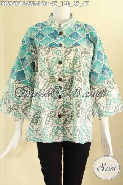 Jual Batik Blouse Solo Modis Kombinasi 2 Motif, Baju Batik Big Size XXL Untuk Wanita Gemuk, Model Kerah Shanghai Lengan 7/8 Pakai Kancing Depan Hanya 150K [BLS9591C-XXL]