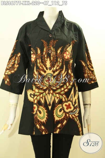 Jual Batik Blus Big Size, Busana Batik Kerja Wanita Gemuk Kerah Langsung Motif Keren Proses Tulis, Penampilan Lebih Trendy [BLS8677T-XXL]