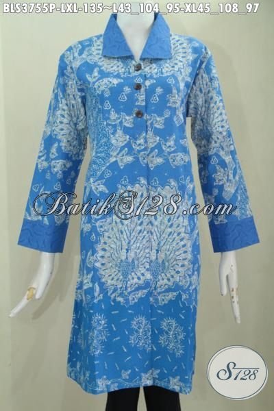 Jual Batik Blus Warna Biru Motif Baru Yang Lebih Fashionable, Baju Batik Wanita Terkini Desain Berkelas Cocok Untuk Santai Dan Resmi Proses Print Asli Solo [BLS3755P-L , XL]
