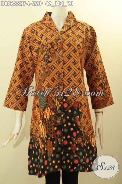 Jual Batik Dress Ukuran L Model Kerah Langsung, Busana Batik Modern Motif Elegan Klasik Warna Etnik Proses Printing Daleman Full Tricot, Cocok Untuk Acara Resmi [DR8688PF-L]