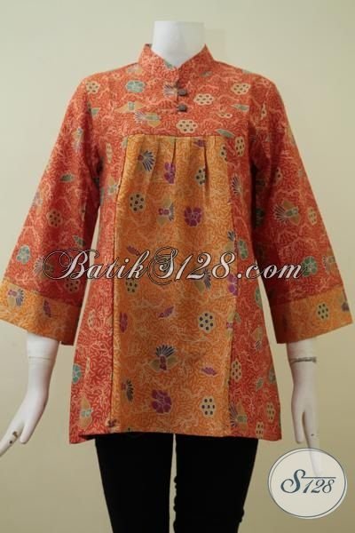 Jual Busana Blus Batik Solo Kombinasi Warna Orange Dan Kuning Berpadu Motif Terkini Membuat Penampilan Wanita Lebih Segar Dan Bersemangat, Batik Print Murmer Kwalitas Bagus [BLS2143P-M]