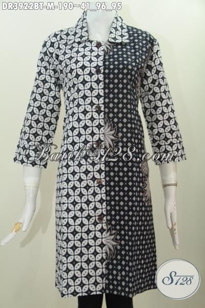 Jual Dress Batik Elegan Motif Klasik Nan Mewah, Baju Batik Hitam Putih Cocok buat Acara Formal Model Kereh Lancip Proses Kombinasi Tulis [DR3922BT-M]