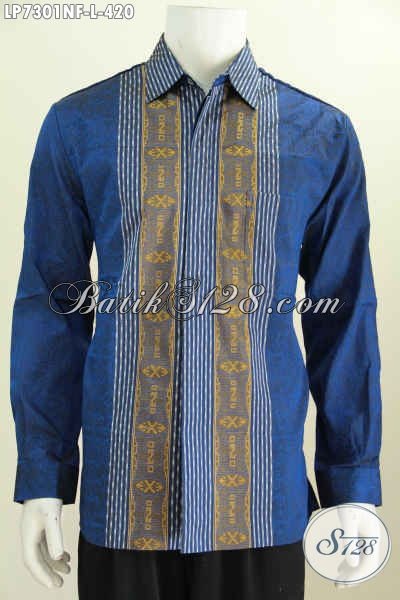 Jual Kemeja Tenun Mewah Lengan Panjang Warna Biru, Baju Tenun Istimewa Motif Berkelas Bahan Adem Model Lengan Panjang Pake Furing Harga 420K [LP7301NF-L]