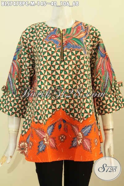 Jual Online Baju Batik Kerja Wanita Karir, Batik Blus Febi Buatan Solo Desain A Simetris Kancing Depan Resleting Harga 145 Ribu [BLS7478PC-M]