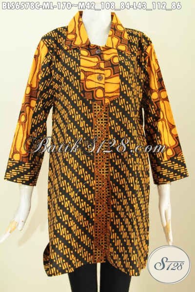 Jual Online Batik Blus Terkini, Busana Batik Jawa Halus Kerah Lancip Kombinasi 2 Motif Dengan Warna Soga Tampil Lebih Elegan [BLS6578C-M , L]