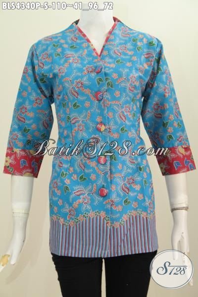 Jual Online Blus Batik Plisir Ukuran Kecil, Baju Batik Kerah Polos Istimewa Warna Biru Dengan Motif Terkini Bikin Penampilan Tambah Gaya [BLS4340P-S]
