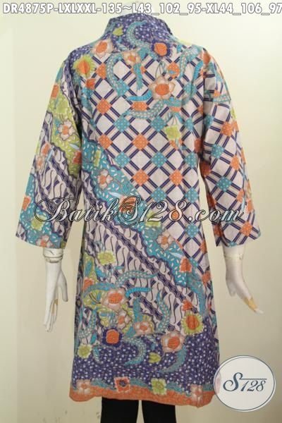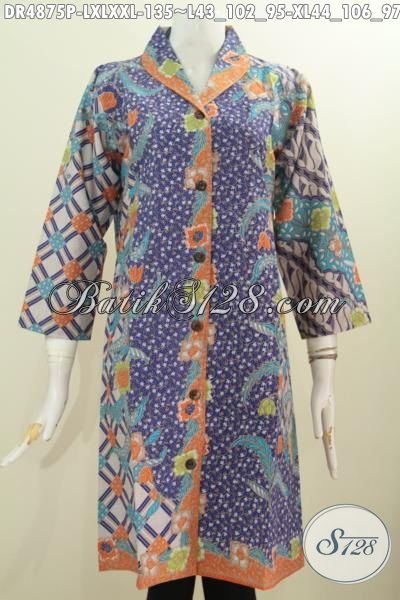 Jual Online Dress Batik Kerah Langsung Bahan Halus Proses Printing Warna Pagi Sore Buatan Solo Daleman Tidak Pakai Furing Harga 135K [DR4875P-L , XL , XXL]