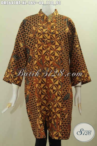 Jual Online Dress Batik Solo Halus, Pakaian Batik Modis Berkelas Trend Model 2017 Pakai Kerah Shanghai Dan Kancing Zig-Zag Bermotif Klasik Kombinasi Tulis Hanya 165K [DR5641BT-XL]