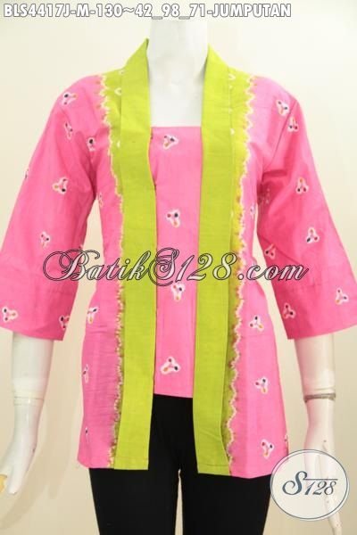 Jual Pakaian Batik Blus Model Kartini, Baju Batik Trendy Dan Halus Motif Jumputan Proses Printing Warna Pink Dengan Aksen Hijau Pupus Lebih Modern Dan Keren [BLS4417J-M]